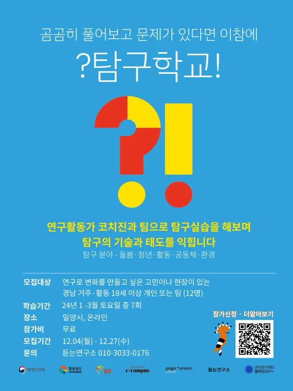 2024년 1월부터 3월 초까지 밀양에서 진행되는 탐구 학습 과정입니다. 연구활동가로 구성된 코치진과 함께 직접 탐구실습을 하며 탐구의 태도와 기술을 배우고 직접 적용해봅니다.