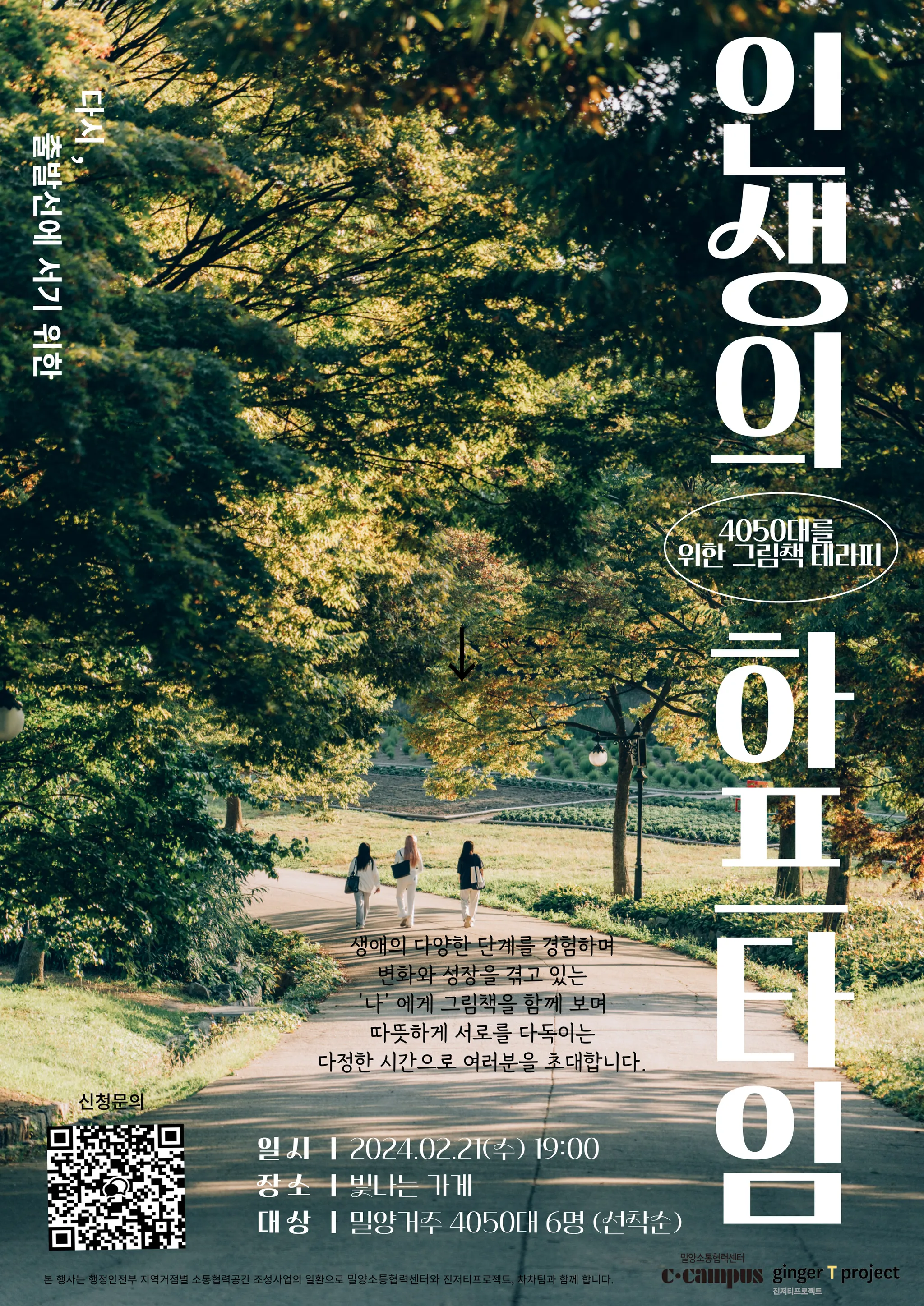 생애의 다양한 단계를 경험하며 변화와 성장을 겪고 있는 중장년층들에게 영아에서부터 노년에 이르기까지 누구에게나 열려있는 그림책을 매개로 다정하고 따뜻한 시간을 제공하고자 합니다. 그림책 테라피의 주제는 ‘인생의 하프타임’ 입니다. 하프타임은 스포츠 경기 용어로 전반과 후반 사이에 있는 휴식시간을 의미합니다. 그림책을 함께 읽으며 출발선에 다시 서기 위해 나의 마음을 마주해보고 정비하며 따뜻하게 다독이는 시간을 가져보고자 합니다.