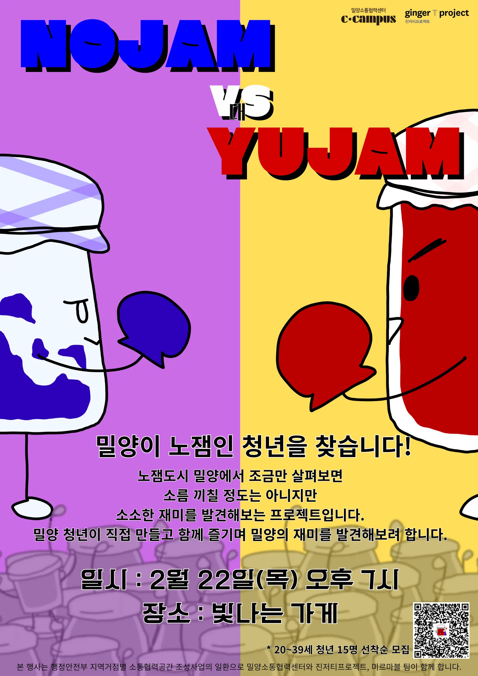 청년들의 즐길거리가 제한적인 밀양에서 청년 스스로 재미거리를 만들며 실행할 수 있는 커뮤니티를 만들어보려고 합니다. 밀양에서 누가 누가 재미없게 사는가 이야기하는 노잼배틀과 밀양의 재미난 곳을 찾아 지도로 공유해 보며 밀양에서 소소한 유잼을 찾아보는 활동을 해보려고 합니다.