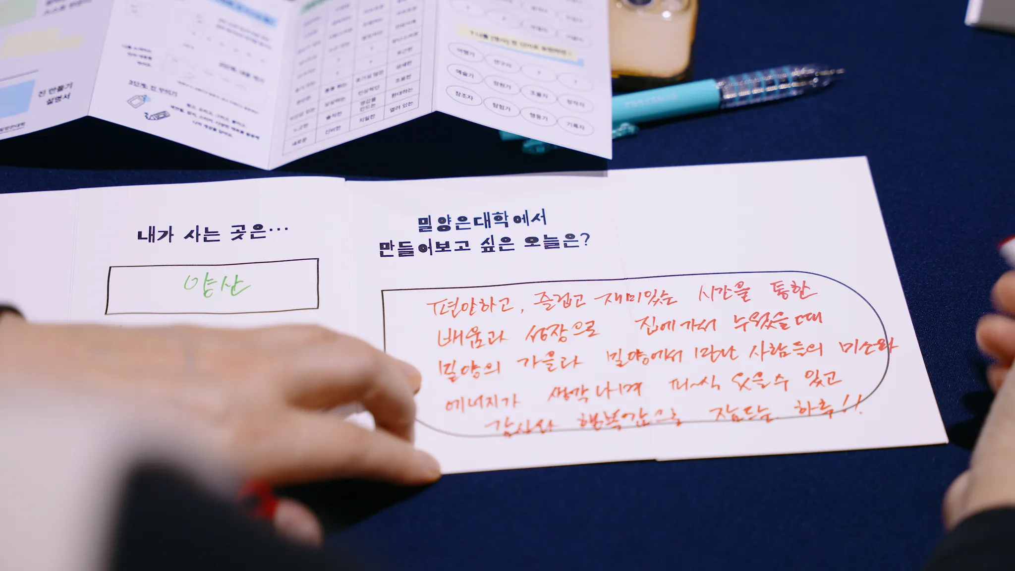 함께 약속도 하고, 입학증서에 자신의 이름도 적었으니 이제 함께할 사람들을 알아갈 시간입니다. 입학식에서 서로를 소개하기 위해 함께 ‘나만의 zine 만들기 워크숍’을 진행했습니다. 나를 소개할 수 있는 키워드를 바탕으로 질문에 답하다 보면 어느덧 서로를 소개할 수 있는 ‘나만의 잡지(zine)’가 만들어지는데요. 나는 어디에서 살고, 내가 사는 곳에서 내가 가장 좋아하는 장소는 어디인지 그리고 밀양은대학에서 만들어보고 싶은 ‘나의 오늘’은 무엇인지 적어보고, 그려보고 서로 소개하다 보니 입학식의 시간이 훌쩍 지나갔습니다.