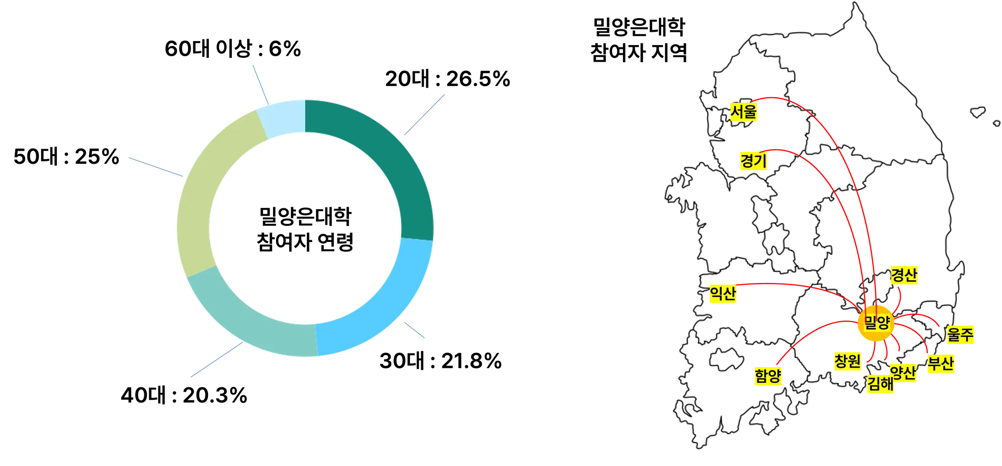 밀양은대학은 학습과 성장의 기회를 통해 다양한 지역의 사람들이 밀양과 관계 맺을 수 있는 계기를 마련하는 사업으로도 의미가 있습니다. 그래서 지역의 경계를 넘어 배움과 성장을 찾아 밀양을 방문한 분들의 발걸음이 반갑고 소중했는데요. 참여자 중에 밀양에 사는 사람이 2/3 나머지 1/3은 밀양 외 지역에서 찾아준 사람들이었습니다.