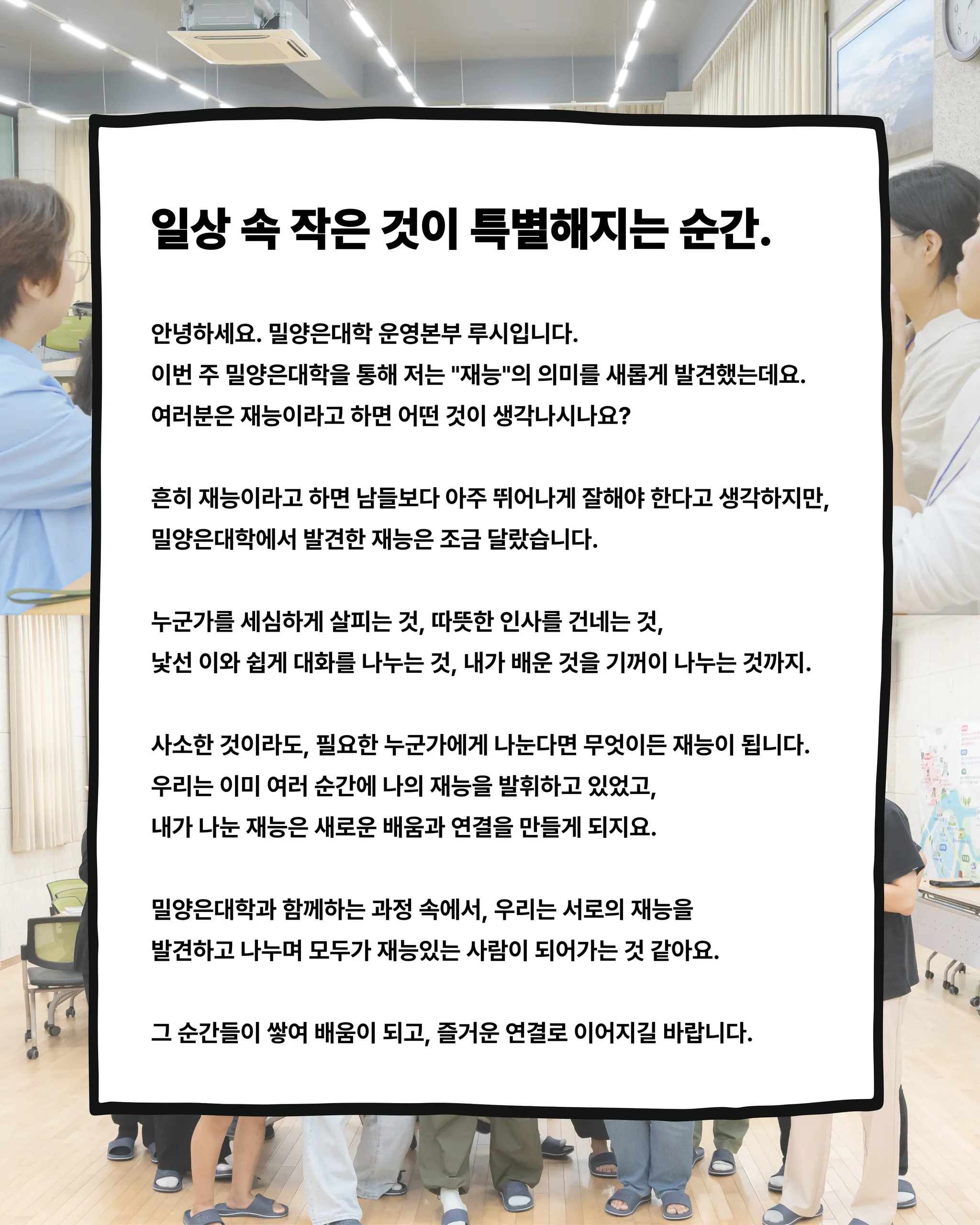 이번 주 자기탐색학과 ‘재능의 발견’은, 잘하는 것보다 할 수 있는 것을 나누며 서로 연결되는 시간이었습니다. 하루 한 개씩 글쓰기, 보드게임 잘하는 법, 관계 속에서 덜 혼나는 법 등 각자의 소소한 기술을 공유해보았는데요. 내가 배우고 싶은 것을 알려줄 수 있는 사람이 내 곁에 있고, 동시에 나도 누군가에게 도움을 줄 수 있다는 것을 알게 되었습니다. 누가 더 잘하고 못 하는지는 중요치 않고, 배움에는 끝이 없다는 것을 느끼며 함께 관계 맺는 즐거움을 나눴습니다.