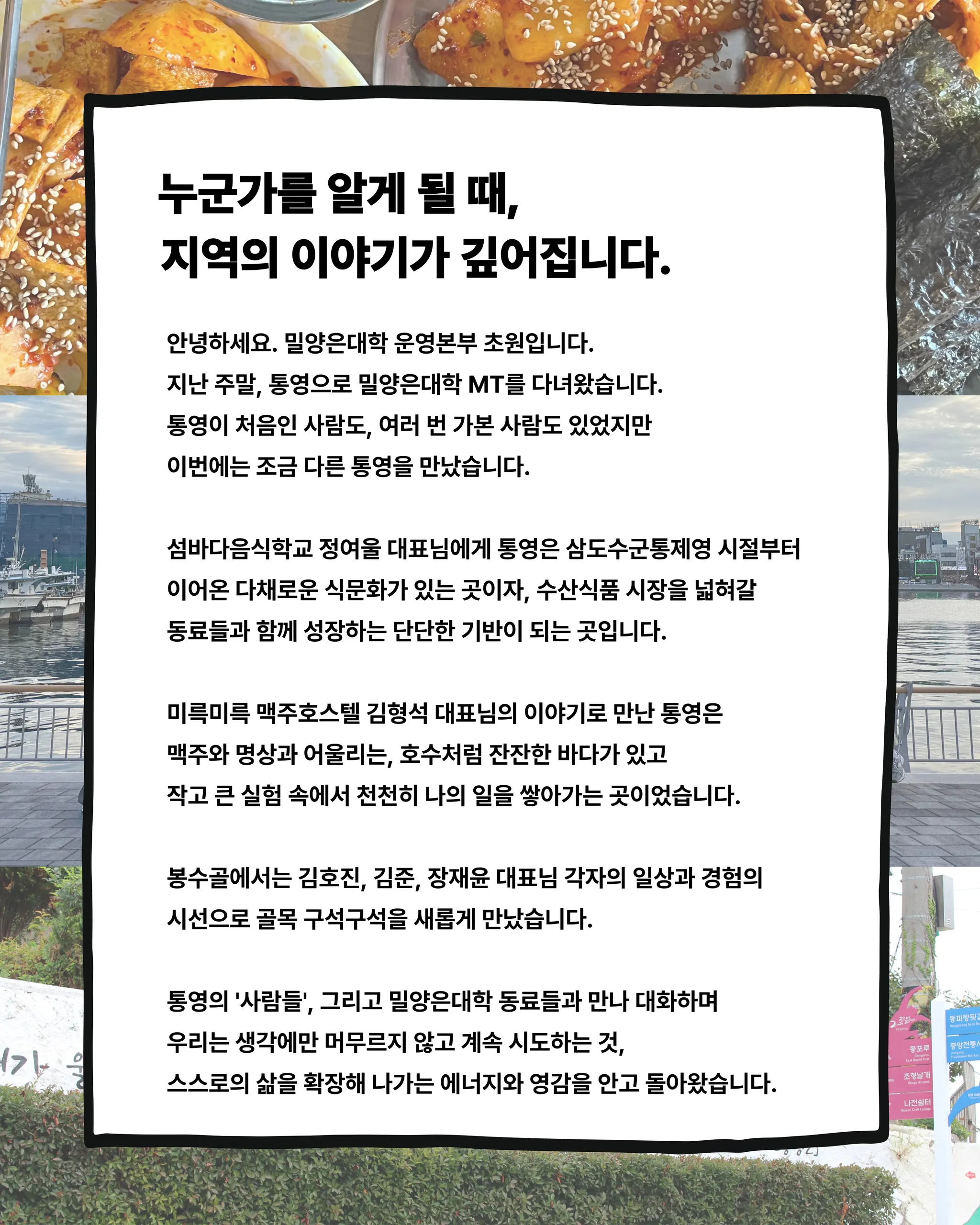 이번 MT에서는 통영에서 자신만의 라이프스타일을 만들어가고 계신 5명의 주민 분들을 만났습니다. 이번 MT에서 만난 모두가, 기꺼이 자신의 경험과 삶을 솔직하게 나눠주셔서 몰랐던 통영의 매력을 만나게 된 의미 있는 시간이었습니다.