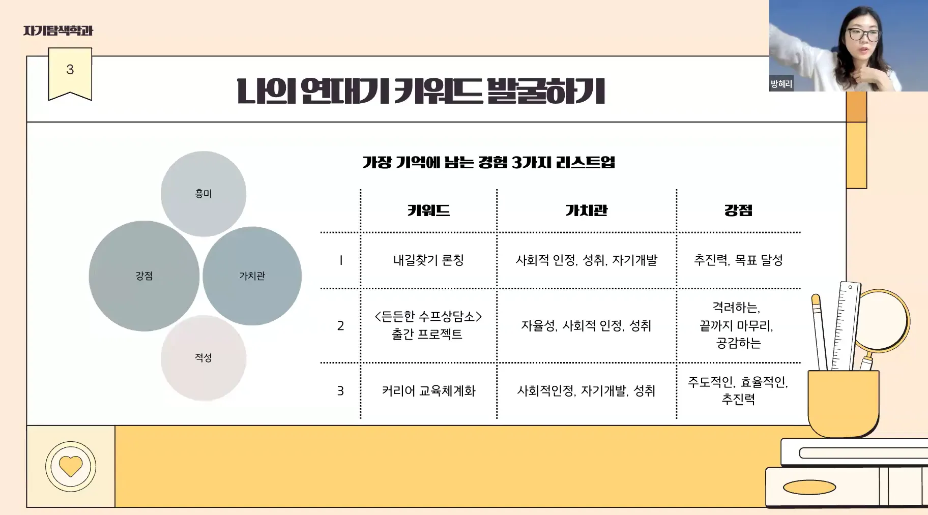 자기탐색학과는 방혜리 강사님과 기록의 발견 두 번째 시간을 가졌습니다. 이번 시간에는 자신의 경험과 감정을 구체적이고, 능동적인 문장으로 직접 써보았는데요. 참여자들은 나의 생각에 변화가 있었던 경험들을 ‘연대기’의 흐름으로 작성해보았습니다. 단순히 사건을 나열하기보다, 연대기로 인상 깊었던 순간들을 엮고, 돌아보며 그 속에 담긴 나의 가치관과 성장의 의미를 찾을 수 있었습니다.