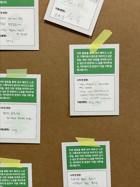 11월 8일 열린 졸업식과 졸업전시는 이번 과정을 마무리하는 자리이자, 참여자들이 기록자로서 첫걸음을 내딛는 순간이었어요. 전시장에는 완성된 잡지와 함께 기사 발췌문과 사진이 패널 형태로 배치됐고, 이 모든 과정을 함께한 자랑스러운 얼굴들을 만날 수 있었습니다. 무엇보다 글과 사진을 통해 ‘보이지 않던 이야기’를 발굴해냈다는 자부심이 곳곳을 채웠고요.