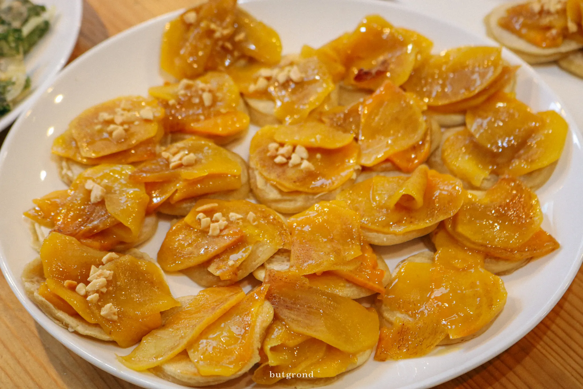 2조는 <밀양살아보기전>이라는 이름으로 단감, 사과 같은 가을 재료를 활용한 전과 팬케이크를 완성했답니다. 된장과 유자청, 꿀을 섞은 된장소스가 현장에서 엄청난 반응을 얻었던 기억이 나요. “이런 소스라면 밀양에 살아야겠는데요?”라는 벗님의 말에 웃음이 빵 터지기도 했답니다.