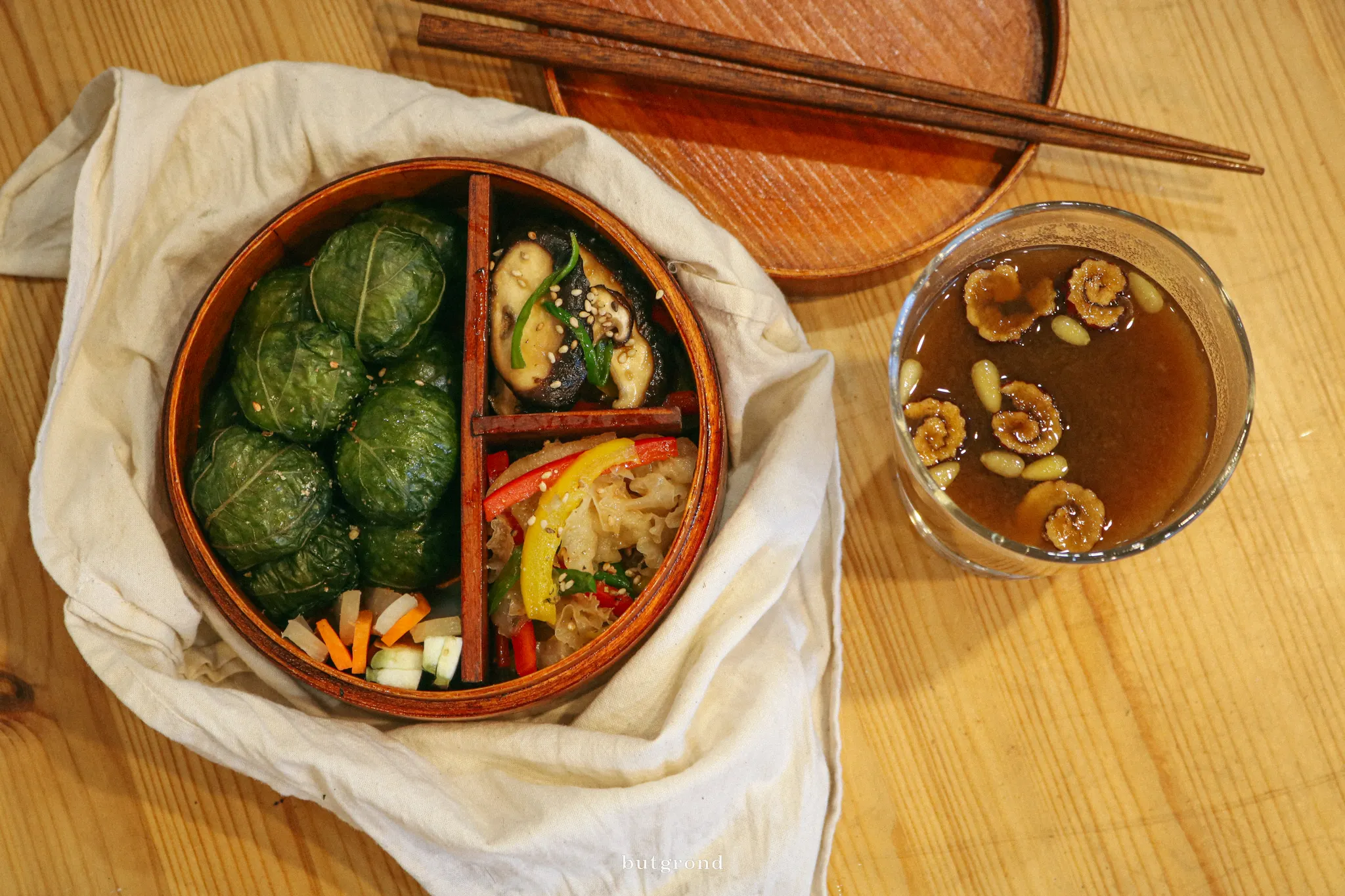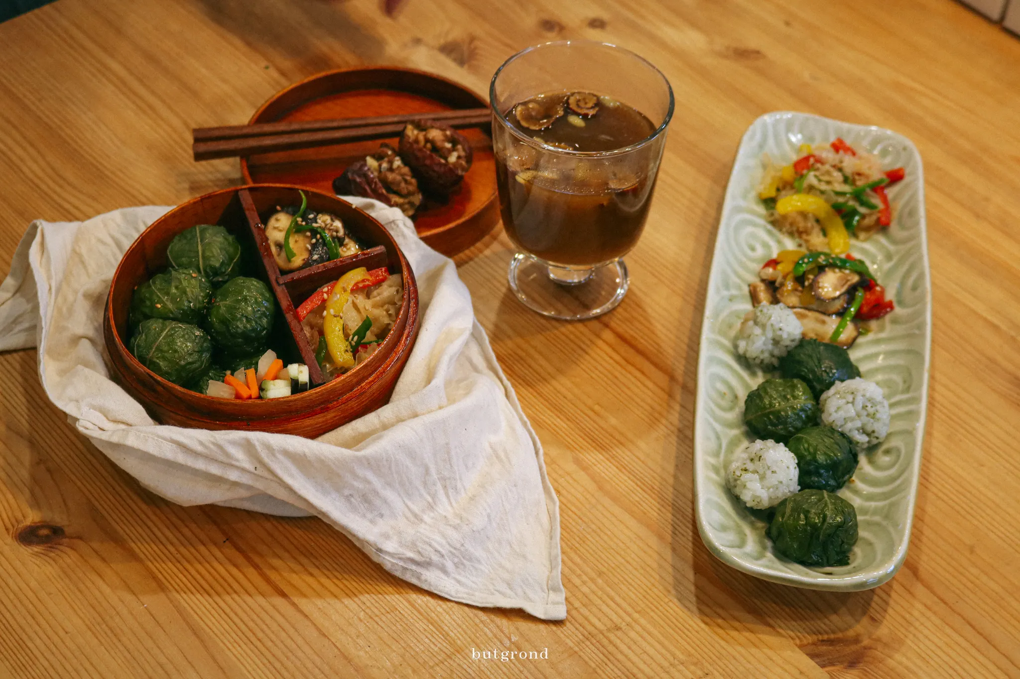 1조는 여행자의 도시락을 만들었어요. 귀도·하도·진안도 세 지역의 쌀로 빚은 작은 주먹밥에, 깻잎 시오즈케와 표고 들기름볶음을 곁들였습니다. “슴슴한 간이 오히려 재료의 맛을 살려준다”는 어느 벗님의 말처럼, 1조의 도시락은 낯선 여행자에게 건네는 ‘밀양의 마음 한 조각’ 같은 플레이트였어요.