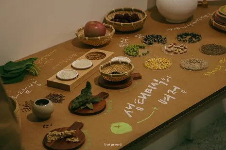 11월 8일 열린 졸업식과 졸업 전시는 지난 세 달 간의 생태미식 여정을 마무리하는 자리이자, 로컬 플레이트를 선보이는 순간이었어요. 전시장에는 우리가 농가에서 만났던 다랑협동조합의 토종쌀 3종과 구배기된장에서 직접 만든 집장·된장, 깻잎·사과·대추 등, 밀양의 맛과 감각을 떠올릴 수 있는 대표적인 식재료들을 함께 전시했습니다.