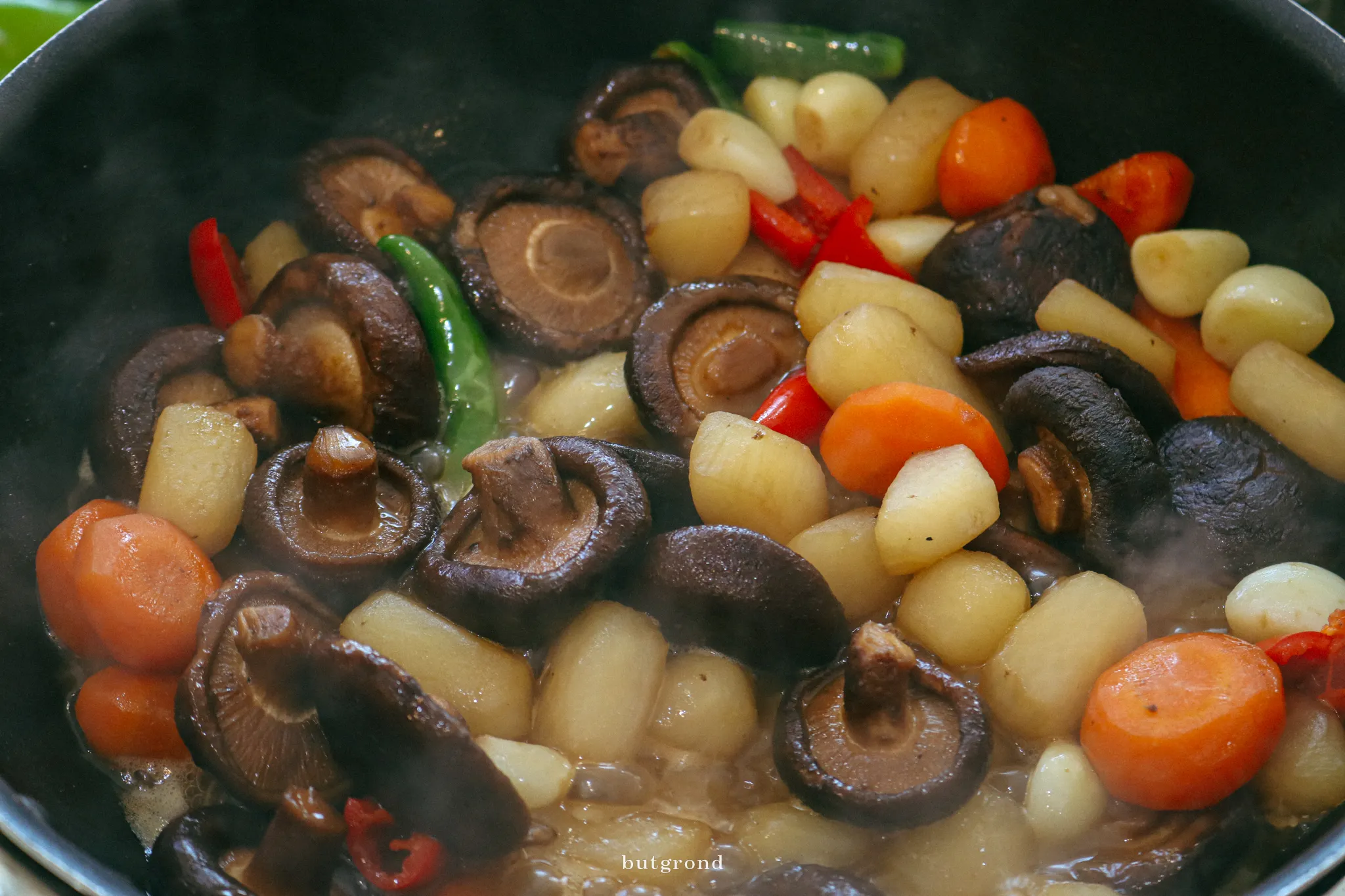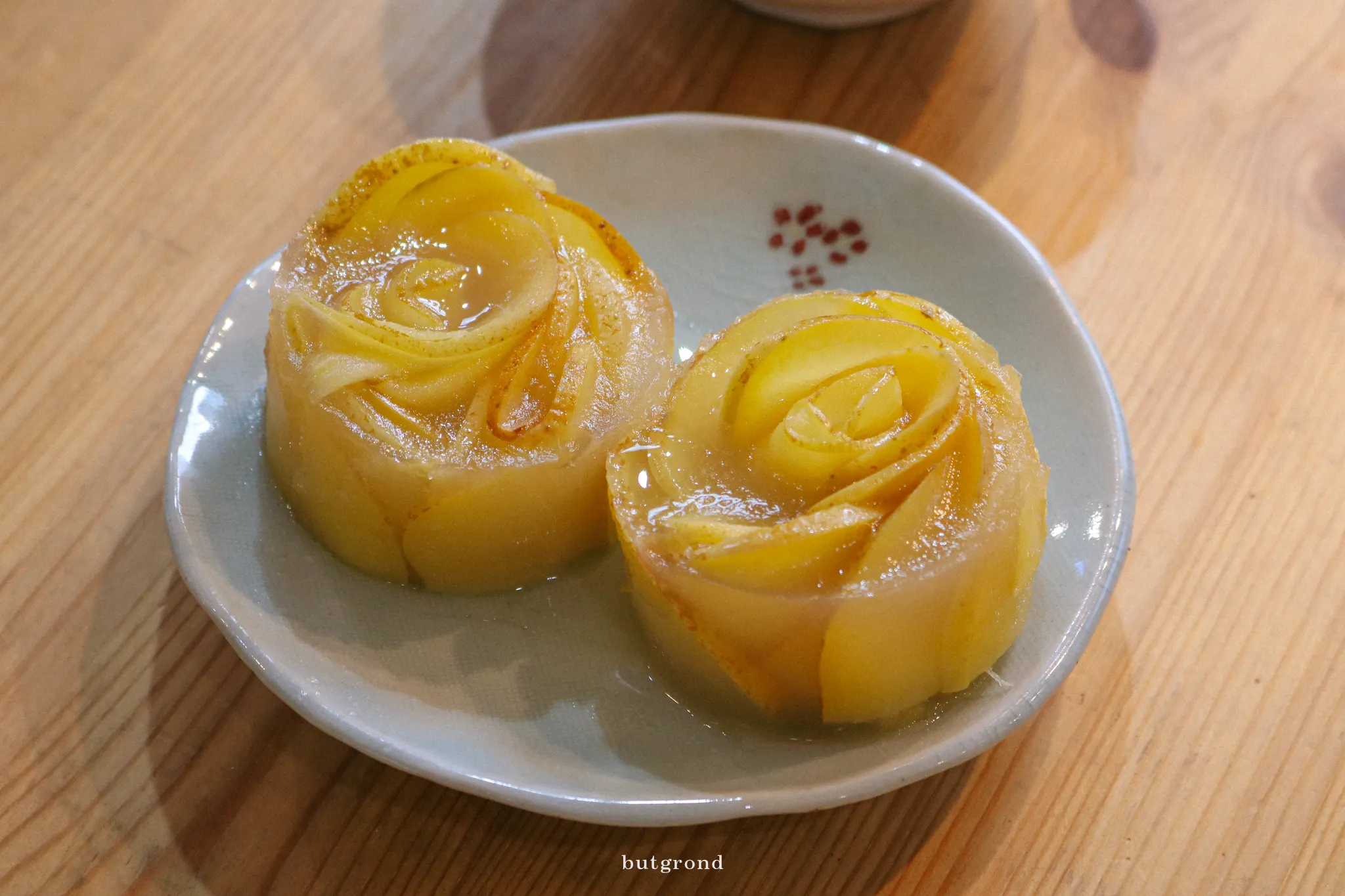 분식이라는 컨셉에 맞게 여러 음식을 선보였던 3조의 플레이트는 과연 역대급 풍성함이었어요. 벗님이 집에서 따로 만들어오신 사과젤리와 사과샤베트, 분식 스타일 제대로 살린 가래떡볶이와 채소/버섯 튀김, 달콤한 간장소스를 머금은 표고버섯조림까지. 특히나 버섯조림은 채소 모양 하나하나 다듬어서 요리 시작부터 끝까지 졸였던 거라 그런지, 더더욱 정성과 노력이 담긴 맛이 났어요.
